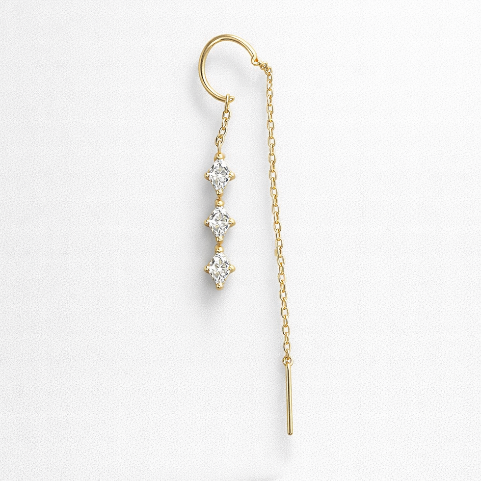 העגילים מעוצבים עם שרשרת שממנה יורדים שלושה זרקונים בצורת מעויין, המעניקים לתכשיט מראה נוצץ, ייחודי ואלגנטי